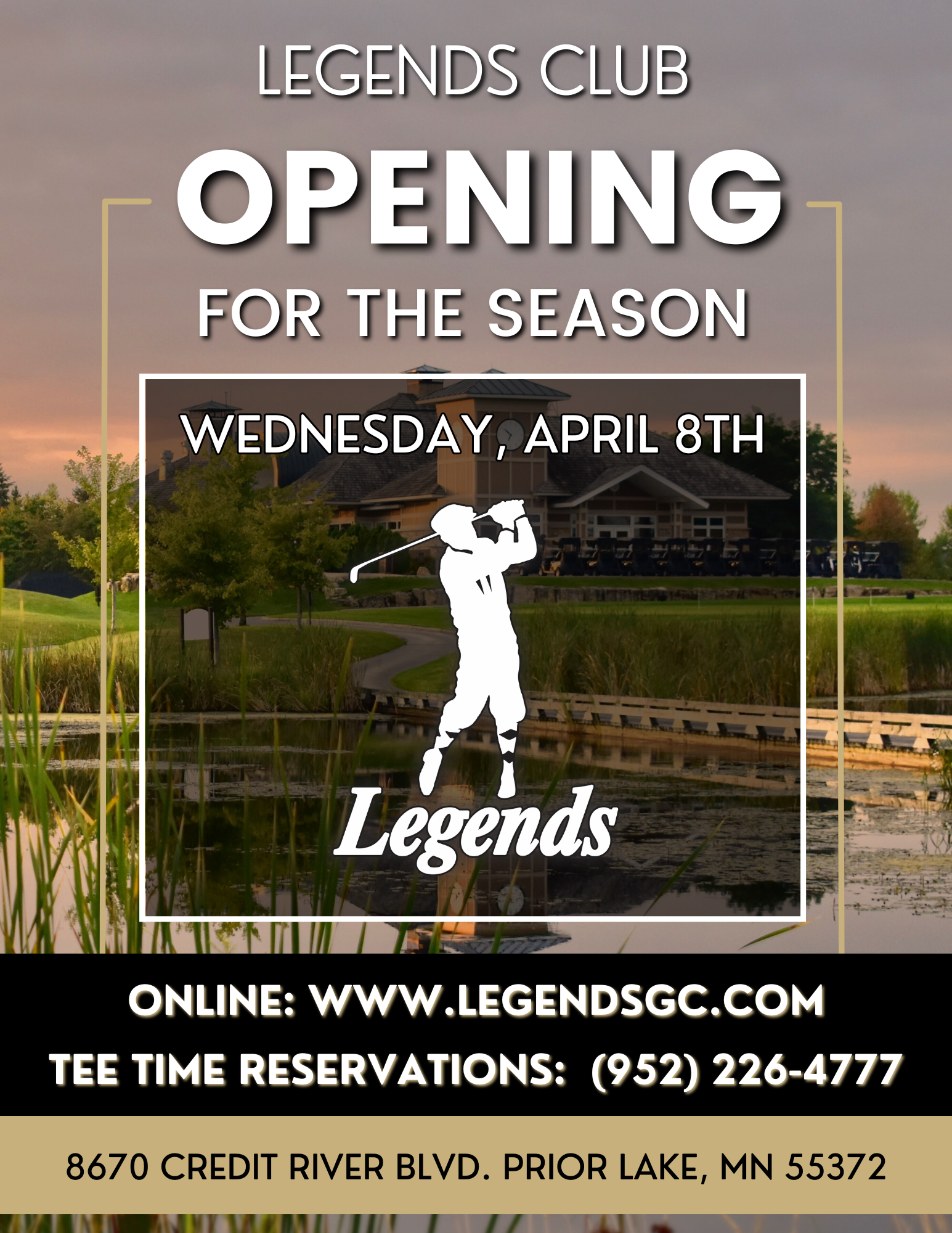 Legends Club, recognized as National Golf Course of the Year, is an 18-hole championship course nestled in a wooded, yet marshy area on the border of Lakeville and Prior Lake in Minnesota. It is conveniently located just 2 miles west from Highway 35, about 25 minute drive from both downtown Minneapolis or St. Paul and 20 minutes from the Mall of America/Airport.